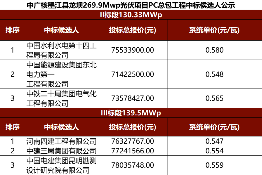 II标段:容量99.2MWAC/130.33MWDC,中国水利水电第十四工程局有限公司以0.58元/瓦位列第一候选人;